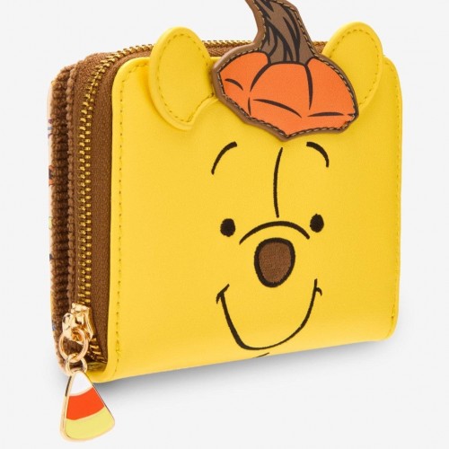Prepare for the fall season with this Winnie the Pooh wallet! Featuring Pooh Bear’s embroidered face with a pumpkin top applique on the front, the back includes an allover print of characters in costumes. With a candy corn zipper pull, this wallet includes an accordion pouch, four card slots, a clear ID sleeve, and a magnetic closure.