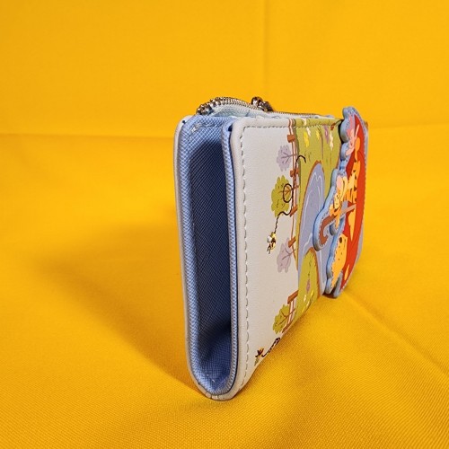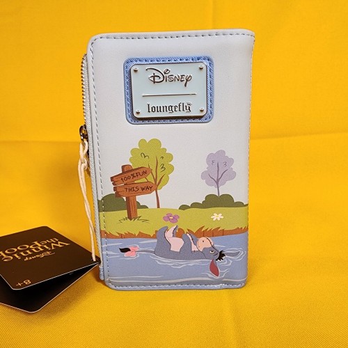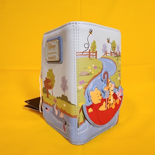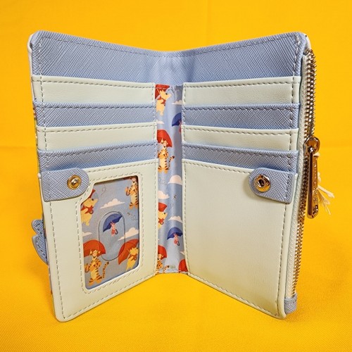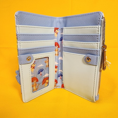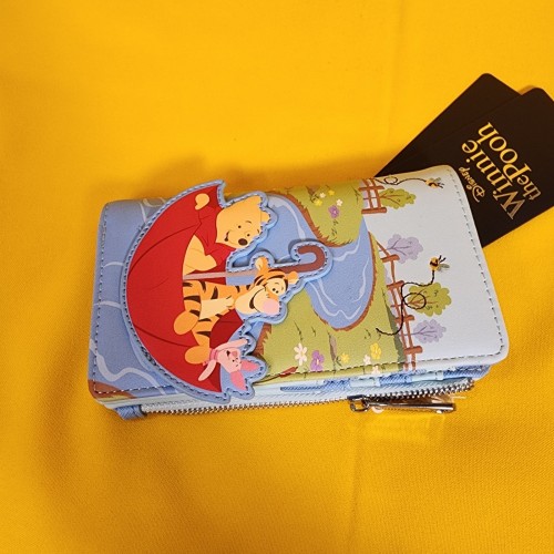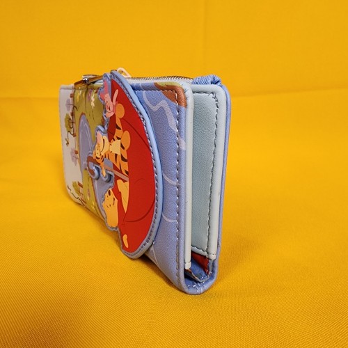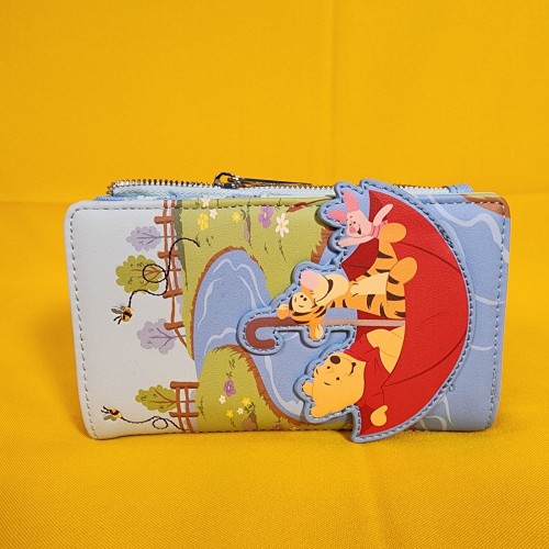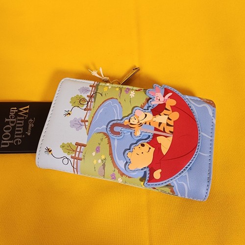 Save up for a rainy day with this Winnie the Pooh wallet! Featuring an applique of Pooh Bear, Tigger, and Piglet in an umbrella with embroidered bees on the front, the back includes a design of Eeyore. Make this the perfect gift for that special someone… or just treat yourself!