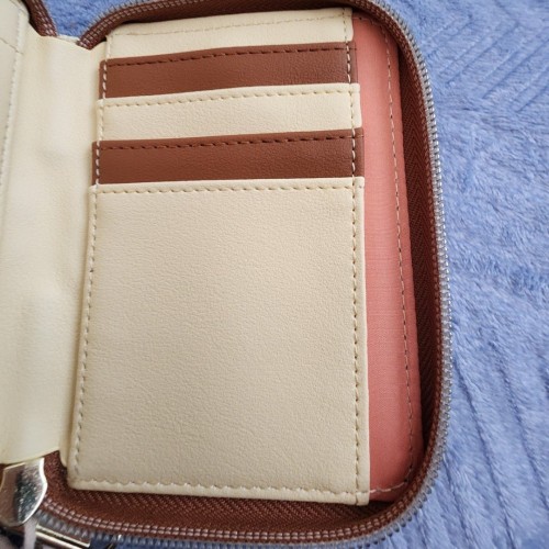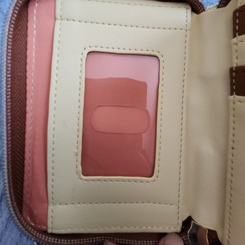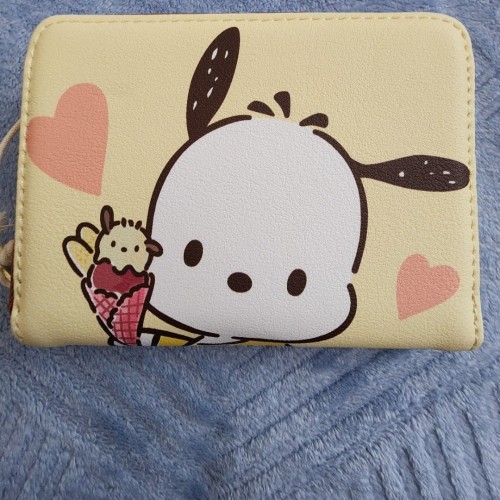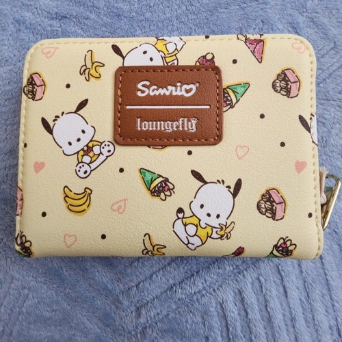 Did you know Pochacco’s favorite food is banana ice cream? This banana-yellow and brown mini zip wallet shows Pochacco holding an ice cream cone on one side, and the other side shows him holding banana cupcakes and other sweet treats, plus other desserts and bananas floating around. The inside has card and cash slots plus clear ID display.