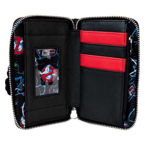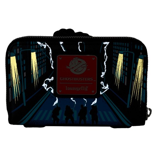Features: Approximately four slots for holding cards, one clear ID holder with a die-cut shape of the Stay Puft Marshmallow Man, zipper for securing items, shiny silver-colored metal hardware, and applique, glow-in-the-dark, and printed details.