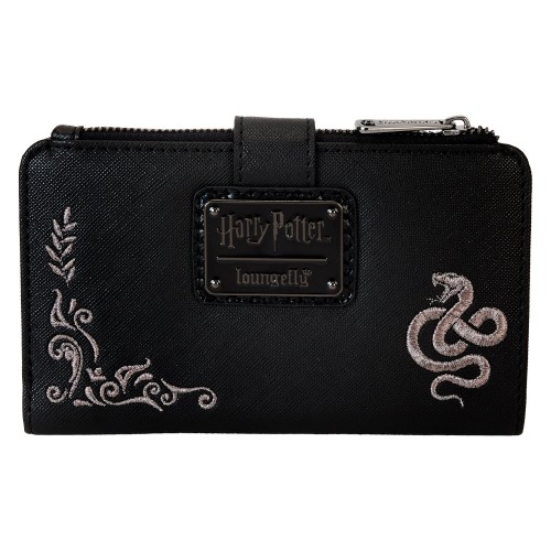 Heading to Malfoy Manor for an important meeting? Do so in style with our Harry Potter™ Death Eater Wallet. This wickedly fashionable accessory features an oval-shaped front flap-snap with a Death Eater’s face that comes to life in applique, silver metallic vegan leather, and embroidered detail. Silver embroidered flourishes appear around the border, with symbols of the skull woven in. On the back, the serpent symbol appears. Secure your valuables for a day of mixing potions or other magical adventures in character.