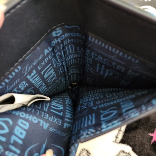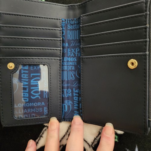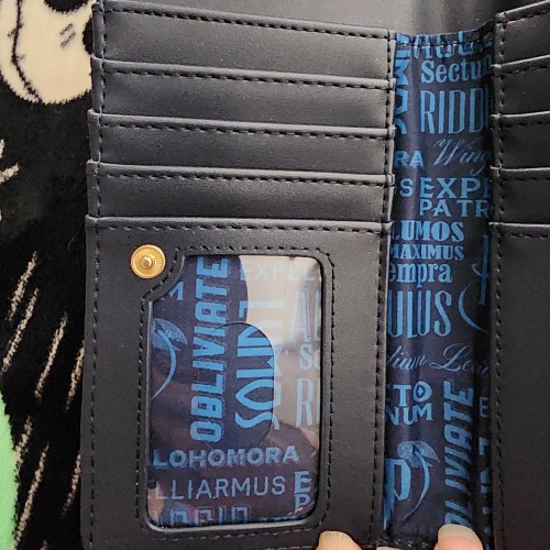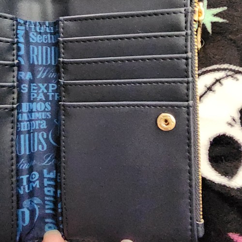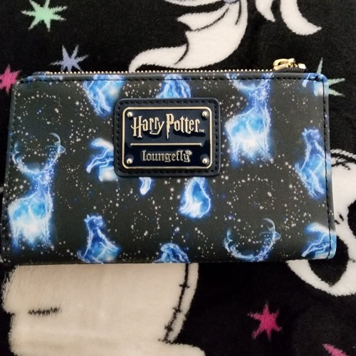 Awesome Loungefly Harry Potter Expecta Patronum. It has a snap closure with slots for credit cards and an ID slot. There is a large compartment on the side of the wallet for bills. There is a zipper pocket on the back inside of the wallet for coins. It is great for everyday use.