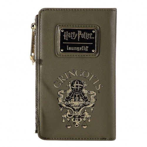 This wallet features an applique of the Gringotts Bank building, envelopped by a menacing dragon. On the back is Loungefly’s signature plaque and a printed emblem of the Gringotts logo.