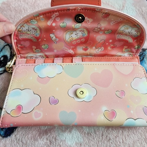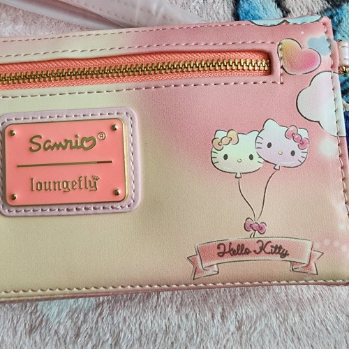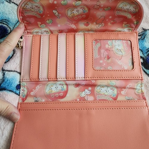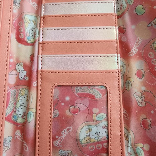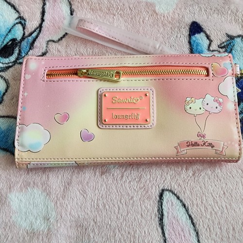 Awesome Loungefly Hello Kitty and Friends Carnival Wallet. It has a snap closure with slots for credit cards and an ID slot. It also has a wristlet. Great wallet for everyday use.