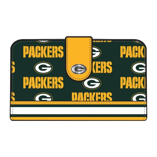 The NFL Green Bay Packers Logo Zip Around Wallet is made of vegan leather (polyurethane). Wallet snaps and zips closed, has sturdy metal hardware, and features: metal rivet, and printed details. Take note of the coordinating pattern of the inside lining fabric.