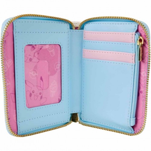 Made with iridescent faux leather, this wallet features Pikachu embroidered front and center. All around are debossed symbols of hearts, Poké Balls, and sweet treats! Inside, you’ll find four card slots and a clear slot for an ID.