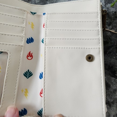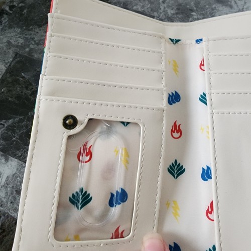 Awesome Loungefly Pokemon wallet. It has a snap closure with slots for credit cards and a ID slot. There is a large compartment for bills and a zipper compartment for coins. Great for everyday use