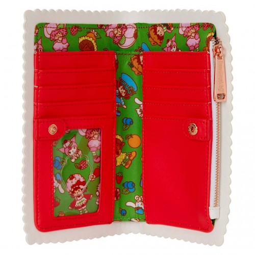 This flap wallet features Strawberry Shortcake and Hello Kitty! They both wear Strawberry Shortcake’s hat and Hello Kitty’s bow! They’re surrounded by embroidered strawberries. Take a look inside to find seven card slots and one clear ID slot. A scalloped edge around the wallet and a strawberry scent makes this accessory extra special!