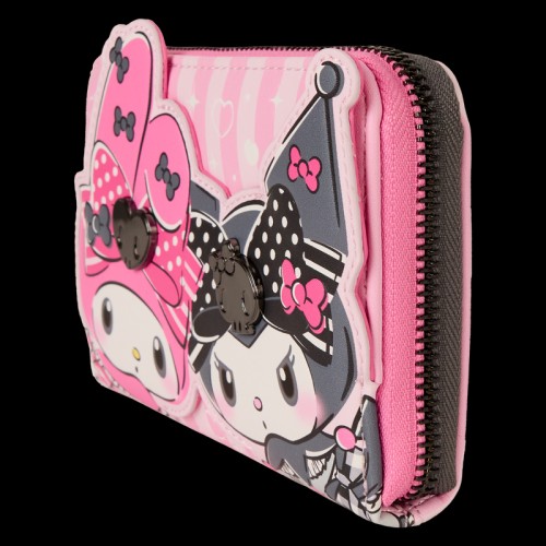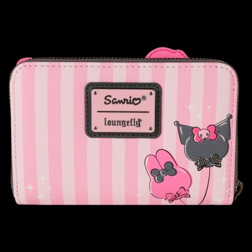 My Melody and Kuromi appear together on the front of this wallet in applique detail. Turn the wallet around to find My Melody and Kuromi-shaped balloons on the back! Open up the wallet to find four card slots and one clear slot for an ID.