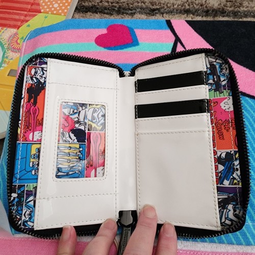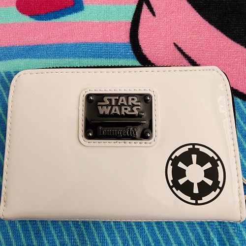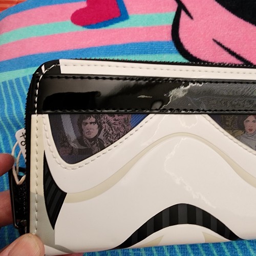 Awesome Star Wars Clone Trooper Helmet wallet with Han Solo, Princess Leia in the glasses. It has a all around zipper closure with slots for credit cards, an ID Slot and a slot for bills. Great for everyday use.
