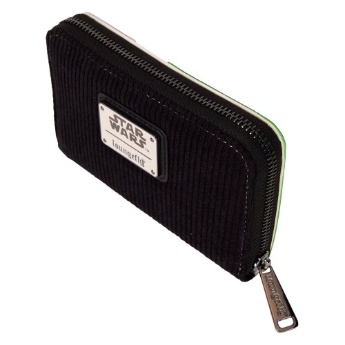 The front of this wallet features Luke’s lightsaber hilt in debossed detail. You’ll find “Luke” written in green foil beneath it. The back is covered in faux corduroy. Open the wallet up to find four card slots and one clear slot for an ID with a die-cut lightsaber cutout.