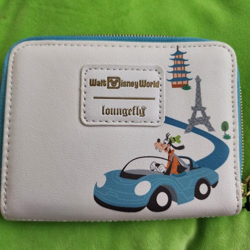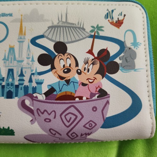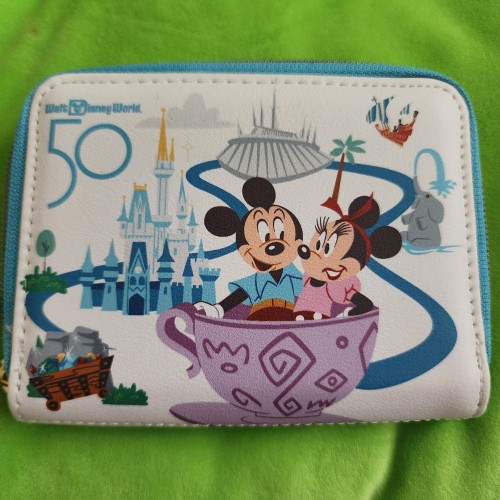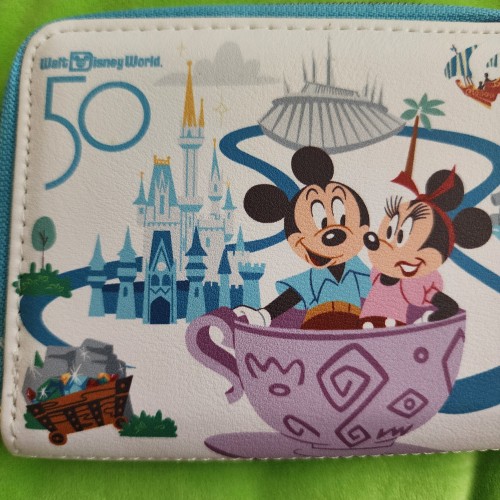 Awesome Loungefly Walt Disney World Mickey and Minnie 50th Anniversary Wallet. It has a zipper closure with slots for credit cards and an ID slot. Great gift for your love one.