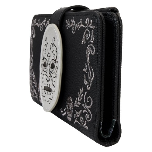 Heading to Malfoy Manor for an important meeting? Do so in style with our Harry Potter™ Death Eater Wallet. This wickedly fashionable accessory features an oval-shaped front flap-snap with a Death Eater’s face that comes to life in applique, silver metallic vegan leather, and embroidered detail. Silver embroidered flourishes appear around the border, with symbols of the skull woven in. On the back, the serpent symbol appears. Secure your valuables for a day of mixing potions or other magical adventures in character.