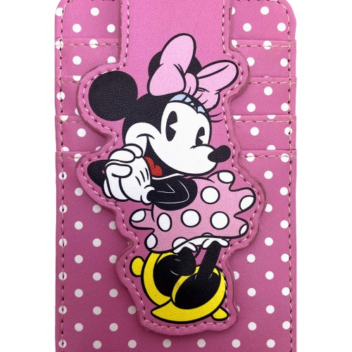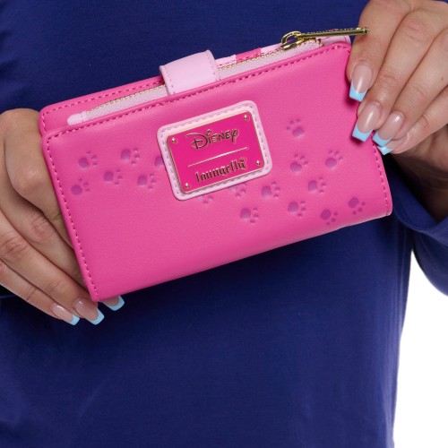 - This wallet showcases the Cheshire Cat with a big grin and playful pose, set against a bright pink background with subtle debossed paw print details on front and back.