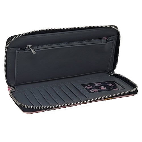 - Zippered coin pouch and two additional billfold /cash pockets. Lined with pink cat paws against a black background.