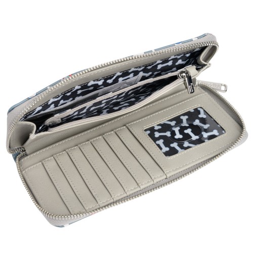 - Zippered coin pouch and two additional billfold /cash pockets. Lined with white dog bones against a black background.