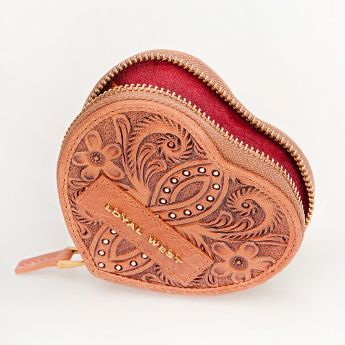 The Cupid Coin Pouch is a beautifully crafted accessory, made from premium hand-tooled calfskin. Shaped like a heart, it features a full handtooled design that adds an intricate, artisanal touch to this small coin purse or wallet. Perfect for carrying coins, cards, or small essentials, its compact size makes it both functional and charming. The heart-shaped design and handtooled details make it a standout piece, adding a unique, handcrafted elegance to your everyday essentials.