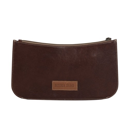 The lovely hand-tooled leather makes this clutch an incredible find. The timeless pattern hearkens to prairie blooms and foliage – simply classic. The back is our deep chocolate leather. The interior features helpful sections, including a zippered pocket. Zipper close top.