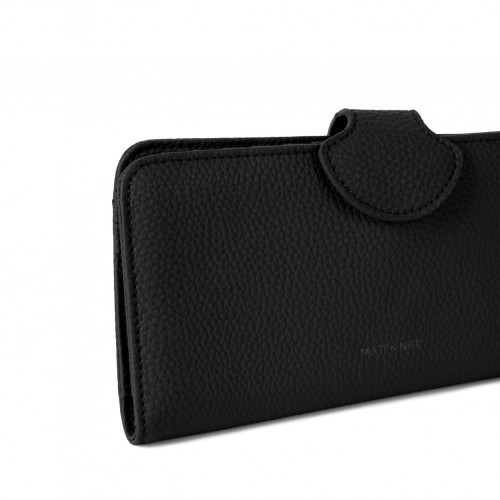 Folded wallet with a tab closure and a zipper pocket at the back.