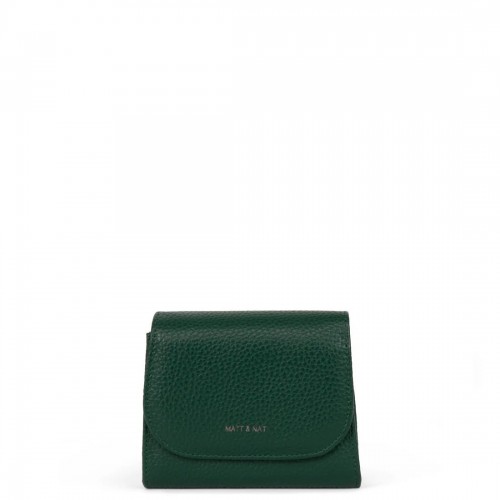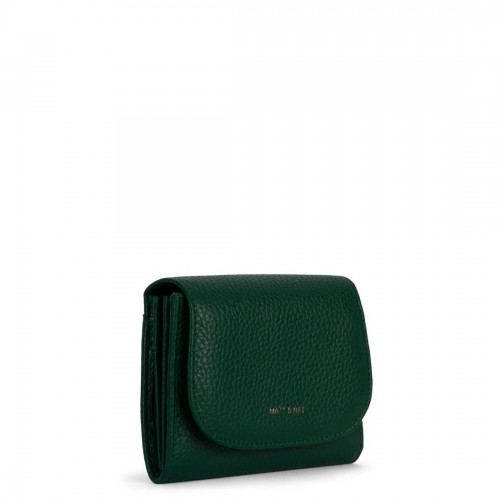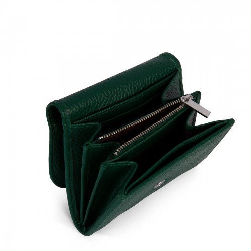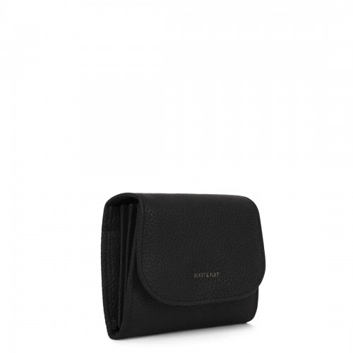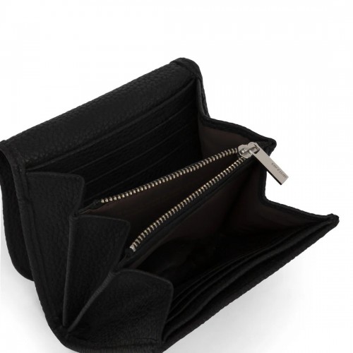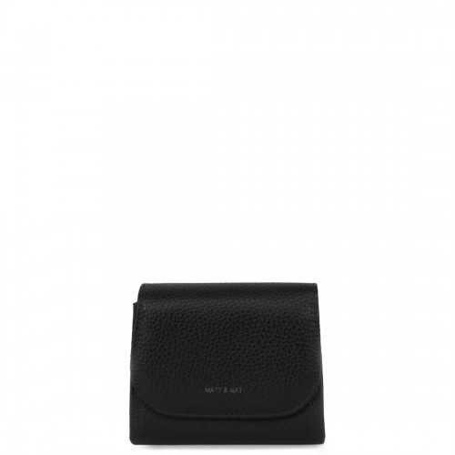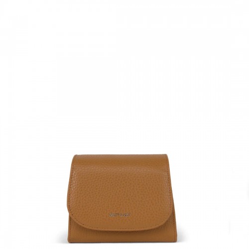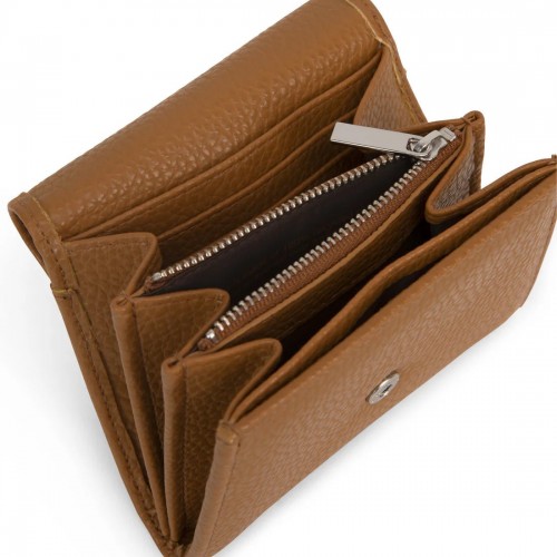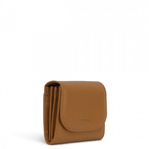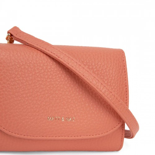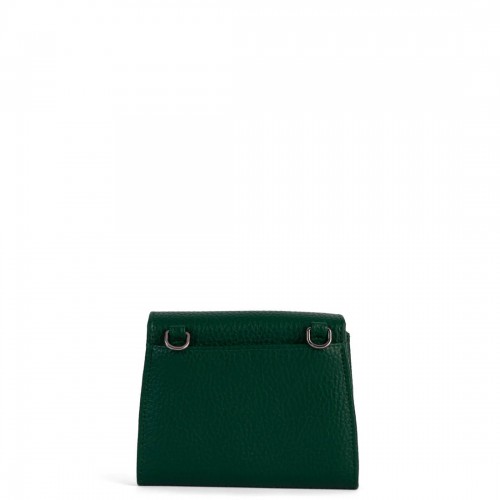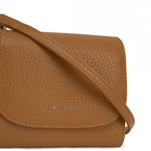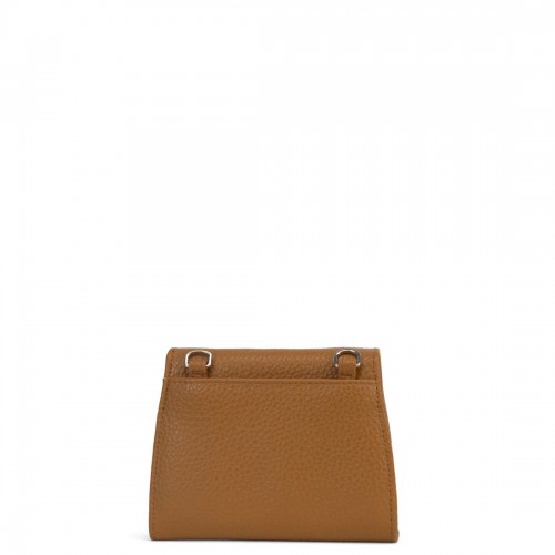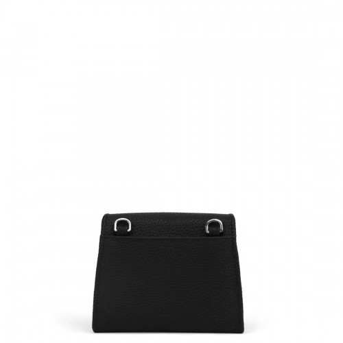 Wallet with a removable crossbody strap, flap closure, slip pocket at exterior back, 8 credit card slots, and a zippered coin pocket at interior.