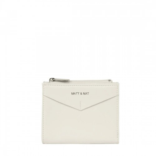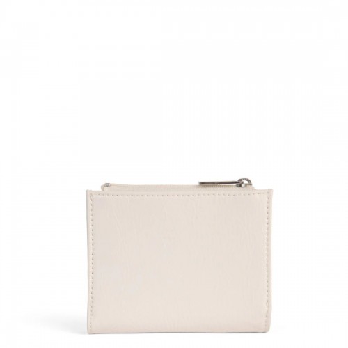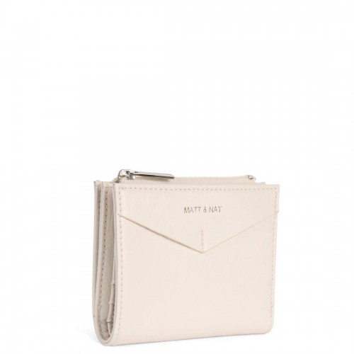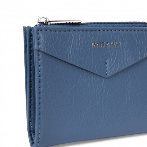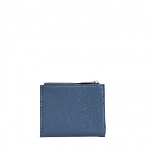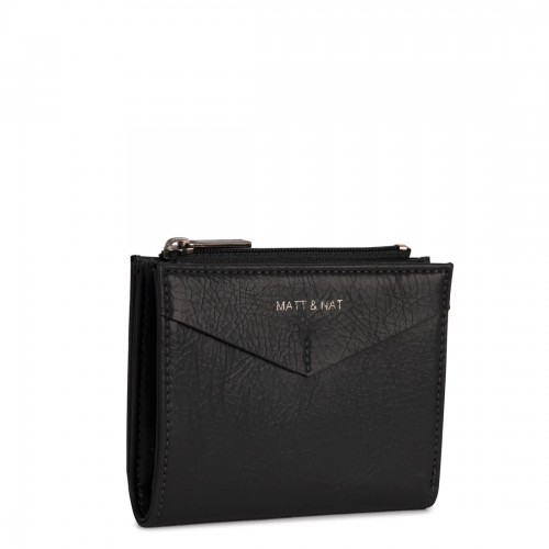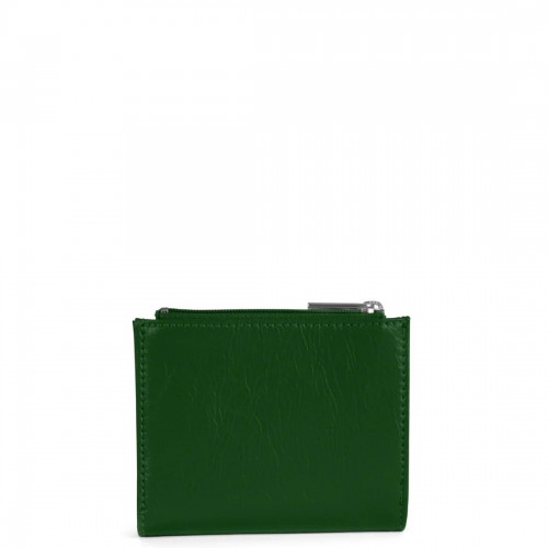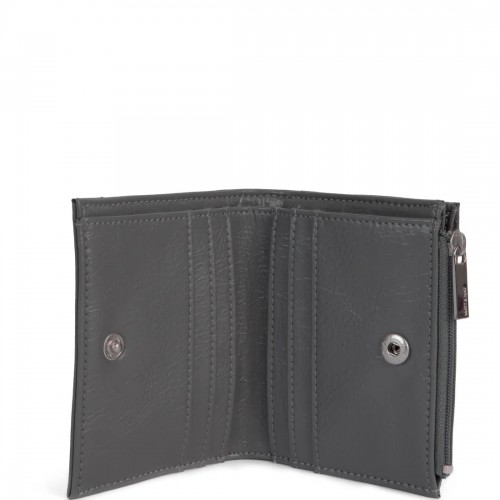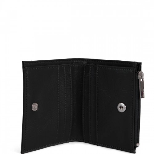 Folded wallet with snap closure, zippered coin pocket, and card slots inside.