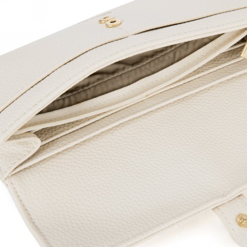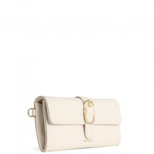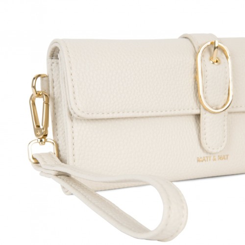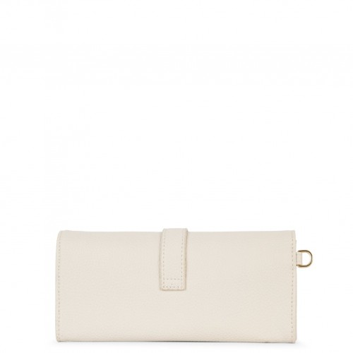 Wallet with a flap closure, decorative buckle detail on the flap, and a detachable wristlet.