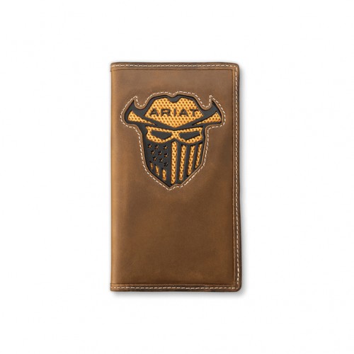 Practical mens 3D money clip. Genuine tan leather with a hand tooled floral design outlined with chocolate buck stitch lacing. Magnetic closure.