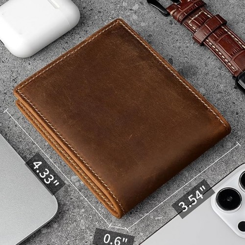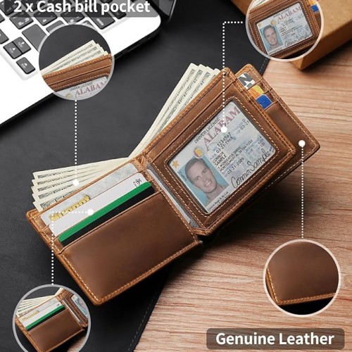 - GENUINE LEATHER — This men’s wallet is made of high-quality top-grain leather, which is water- and abrasion-resistant. The leather will become softer with use, making it easier to insert and remove cards, and ages beautifully with time
