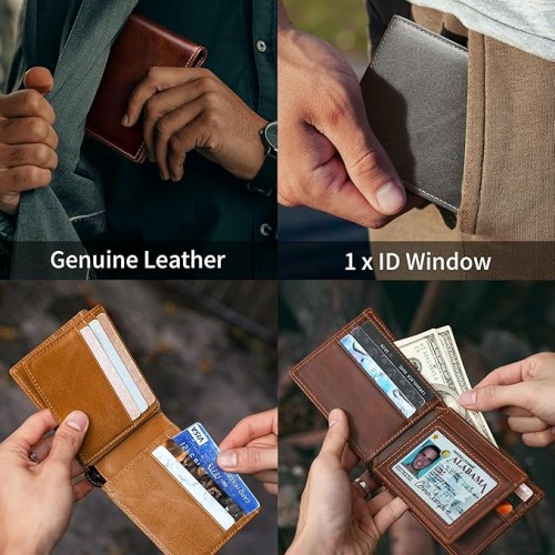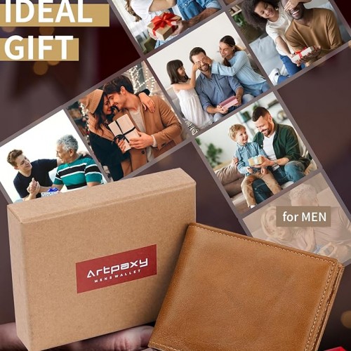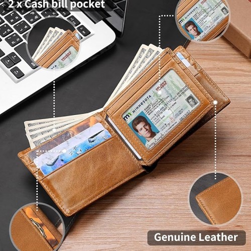 Mens Wallet Genuine Leather Bifold RFID Blocking Wallet for Men with 1 ID Window 13 Card Holders 2 cash pockets 1 Gift Box (Light Brown)