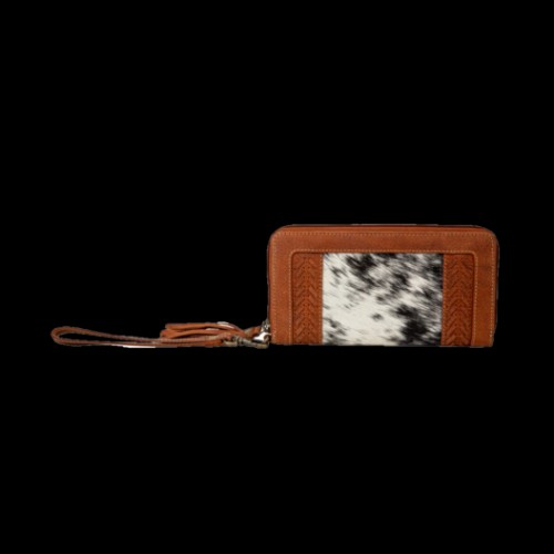 Crafted with natural Black & White leather, this Myra pouch captures rustic elegance in a compact design. The rich brown leather trim, round shape, and wristlet strap make it both functional and stylish. Whether you’re heading to a country concert or exploring the open road, this western pouch adds a bold, down-to-earth flair to your everyday carry.
