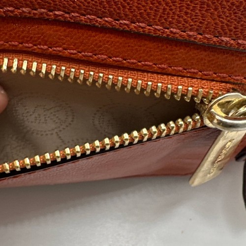 Preloved in great condition with normal wear on the exterior and interior. Please see all pictures. The exterior has a stain in the front of the wallet. Zipper works perfectly. Ready to be used wallet.