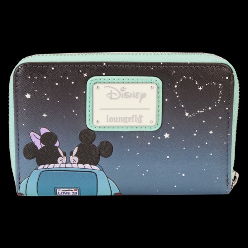It’s a date! Plan fun outings with our Loungefly Disney Mickey Mouse and Minnie Mouse Date Night Movie Drive-In Zip-Around Wallet. On the front of this wallet, Disney’s Mickey Mouse offers Minnie Mouse a flower, as they stand in front of their car at the drive-in movie theater. Applique details bring the scene to life, and the license plate on the car reads “Love 28.” Above them, stars scatter against the night sky. On the back, Mickey and Minnie are seated in their car, gazing up at the stars, with some of those stars forming a heart. Inside, there are four slots for holding cards and one clear slot for displaying your ID. A die-cut shape of Mickey Mouse ears adds a signature touch. Bring your plus one and capture hearts wherever you go with this stylish accessory.