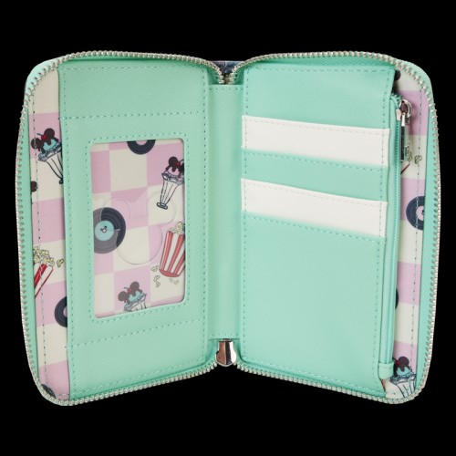 The Loungefly Disney Mickey Mouse and Minnie Mouse Date Night Drive-In Movie Zip-Around Wallet is made of vegan leather (polyurethane). Wallet zips closed with silver-colored metal hardware. Additional features include applique and printed details. Take note of the coordinating inside lining.