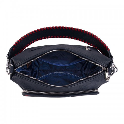 - Inside on the front pocket includes a card slot and an open compartment