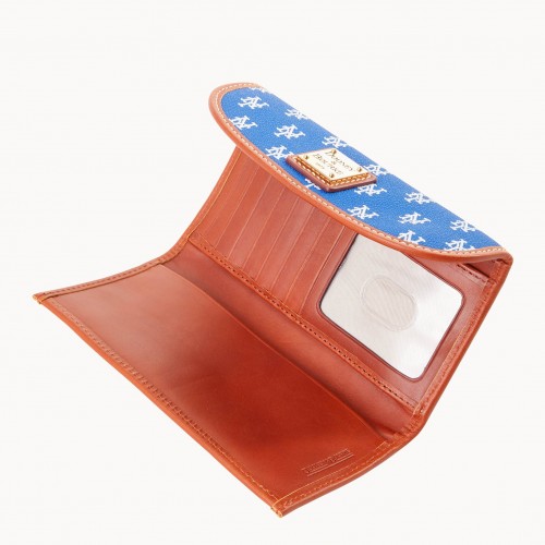 One outside zip pocket. One inside pocket. License pocket with window. Two bill compartments. Seven credit card slots. Lined. Feet. Snap closure.