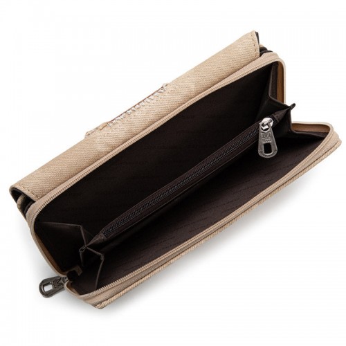 - Zipper closure on the back with a single compartment divided by a medium zippered pocket