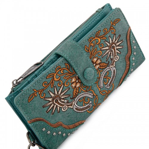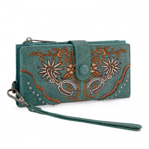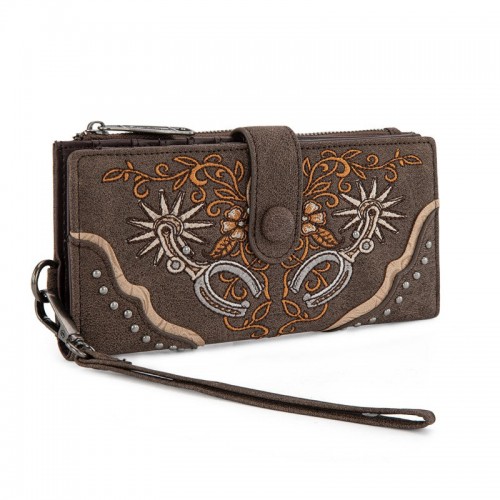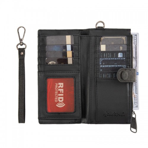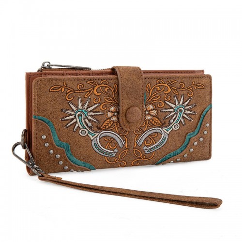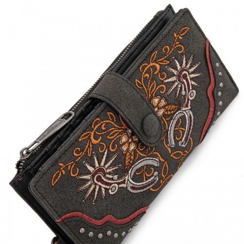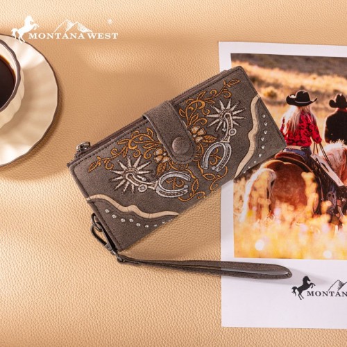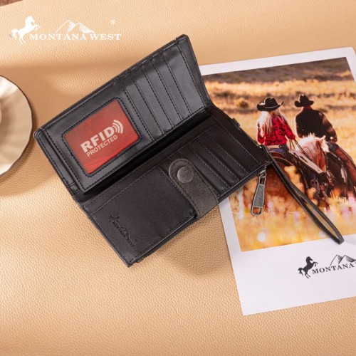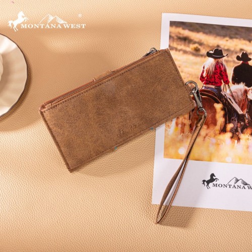The Montana West wallet is a compact, Western-style embroidered wallet crafted from durable synthetic leather. Featuring intricate floral embroidery and a secure zip closure, this wristlet offers RFID protection for cards and cash.