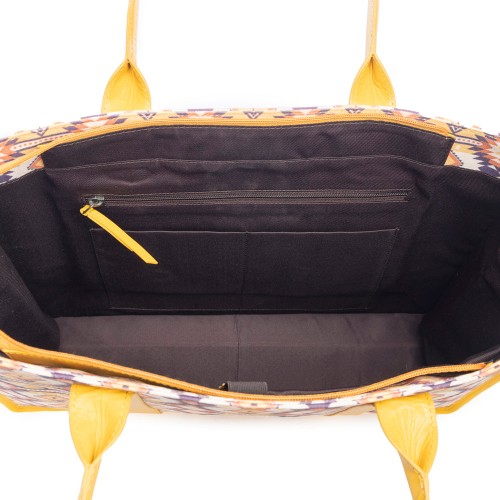 Travel in style with this beautifully coordinated combo, featuring a Weekender Bag and Deluxe Wallet made from upcycled woven canvas with vibrant sunrise yellow leather accents.