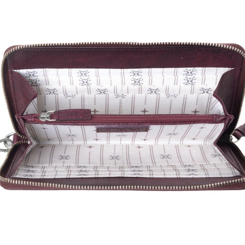 This Myra Zidana western wallet for women in deep wine captures the beauty of western artistry with its elegant weaving and fine leather texture. Featuring a spacious interior, a wristlet handle, and compartments for cards and a phone, it offers the ideal combination of utility and style for everyday use. This limited-edition western leather wallet, handcrafted with vegetable-tanned leather, merges elegance, durability, and sustainable design, and is ideal for travel or daily sophistication.