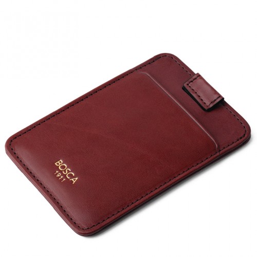 A super-slim minimalist design featuring a horizontal card pocket on one side, and a vertical pocket on the reverse, with a pull-tab to raise cards to easy access. Made in our rich hand-stained, vegetable-tanned Old Leather. Designed for those who almost never hold cash, and need the slimmest form factor and room for several cards. This super-slim card case/mini-wallet carries just enough.