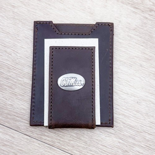 Show your Ole Miss Rebels pride with an original Zep-Pro collegiate leather front pocket wallet. This accessory is popular among college students and alumni. It is a stylish and unique way to show enthusiasm while keeping important cards and cash organized. This Zep-Pro wallet is constructed of full grain leather with a hand burnished finish and features the school’s official logo, proudly displayed on the front.