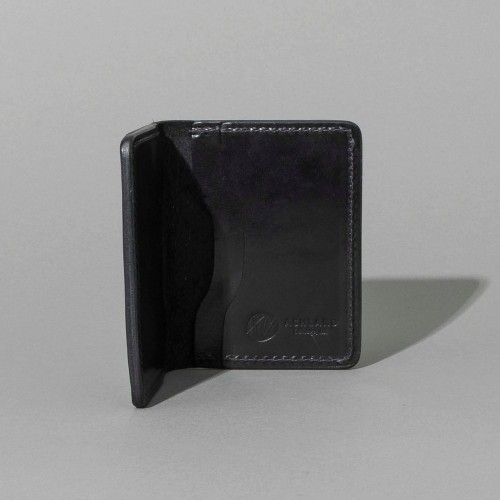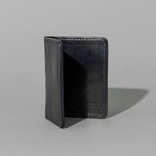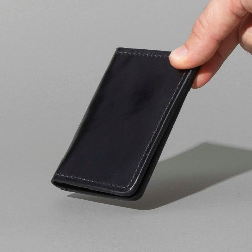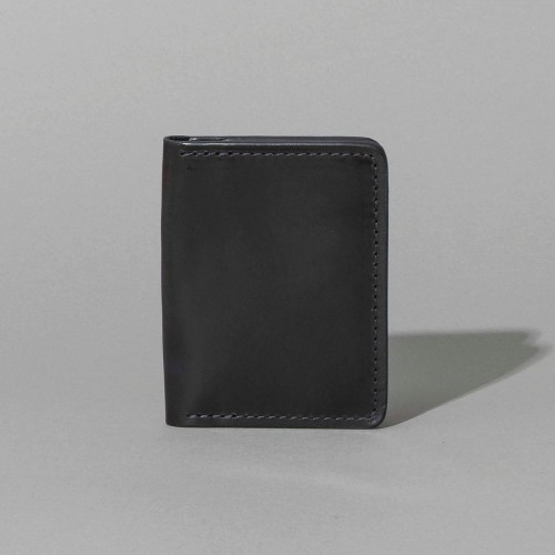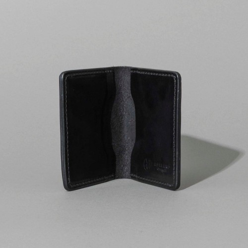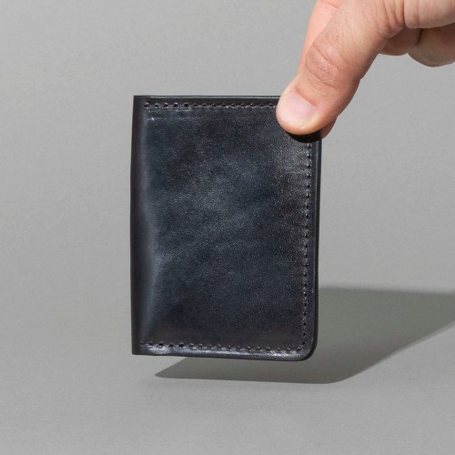 Bugs Moran is a sleek, minimalist leather wallet designed for front or back pocket carry. Its slim design excludes a dedicated bill slot, yet folded cash fits securely within the two larger card compartments.