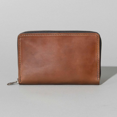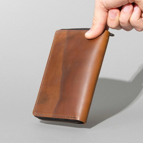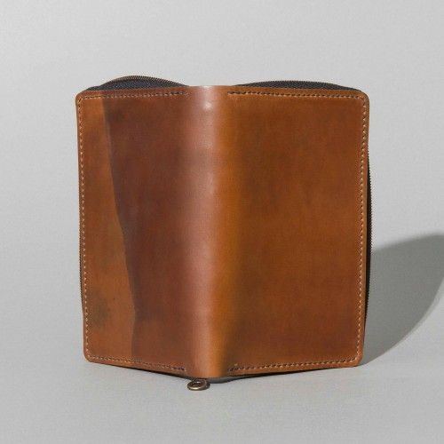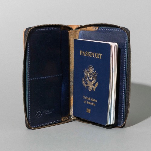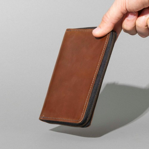 This experimental zipper passport wallet prototype features three credit card slots and two expanded compartments for folded currency. Secure your passport or Field Notes journal within the zippered enclosure for efficient travel. Navigate security checkpoints with ease by simply stowing this wallet in your luggage. Crafted from premium Horween leather, this holder provides sophisticated protection for your essential travel documents.