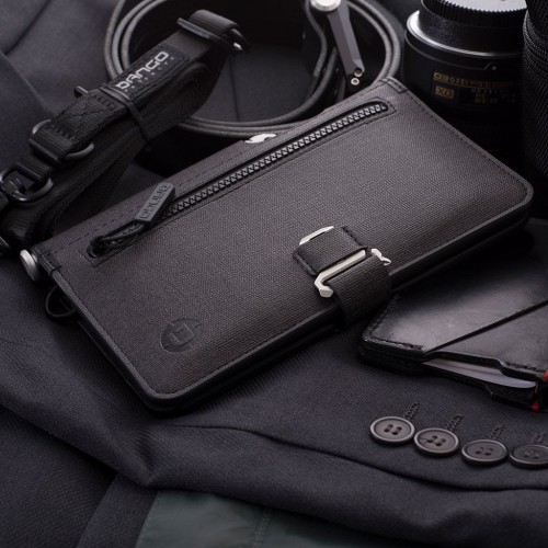 The wallet is RFID protected and has ample storage for your important travel items such as passport(s), cash, keys and cards, and allows easy access to them. It can also fit a smart phone, pen and notebook. In addition, a sleek water resistant pocket is present in the front for small items such as loose change. To securely enclose the wallet, the MT01 Clasp tool is included which is equipped with 5 functions: A chisel, a bottle opener, a 1/4″ hex socket, a flat head screw driver and a Phillips screw driver.