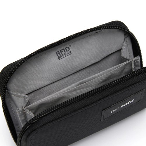 - Attachment point to clip into a Pacsafe bag or to attach wallet strap