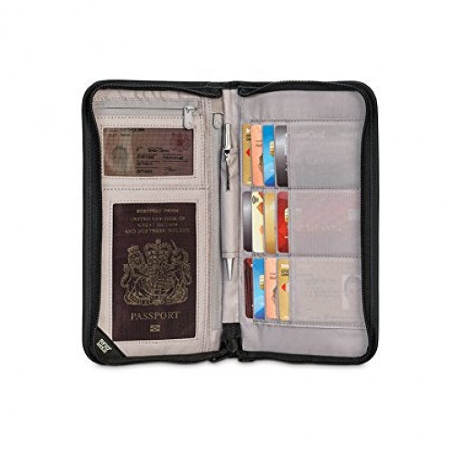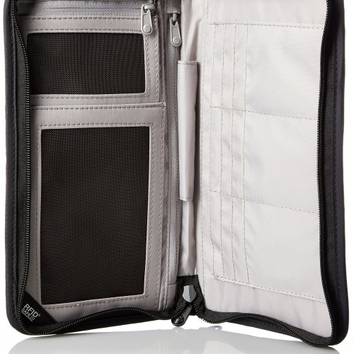 RFID blocking travel organizer with Dyneema webbing strap; ideal organizerthat blocks the transmission of sensitive information and gives peace of mindwhen traveling