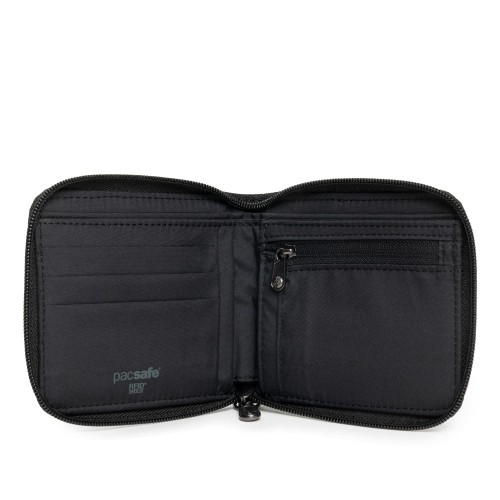 Keep your cards and money in its place with an all-around zipper closure. This bi-fold wallet will also protect your ID and credit cards against unwanted scans with RFID-blocking materials, but also includes a quick scan pocket for your transport cards for easy and fast transactions. Add a cut-resistant wallet strap (sold separately) to the D-ring attachment point on the wallet or use it to clip inside a Pacsafe bag for extra security.