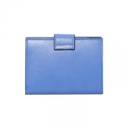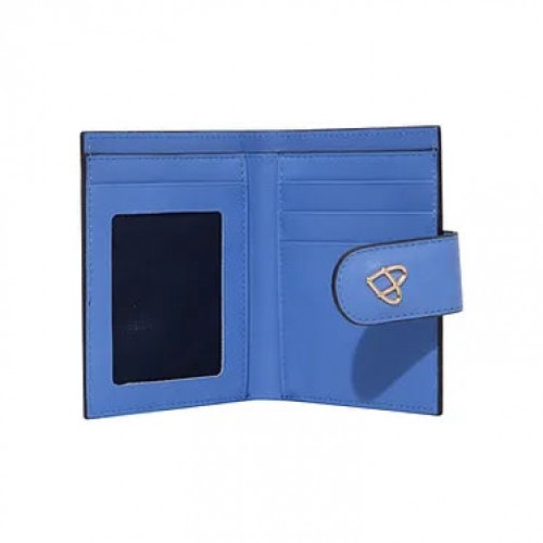 Rose wallet crafted in smooth calfskin with an additional contrast color card pocket on the front. It features four interior credit card slots, a billfold compartment, an ID window, and two extra hidden pockets. Snap closure with a metal logo.