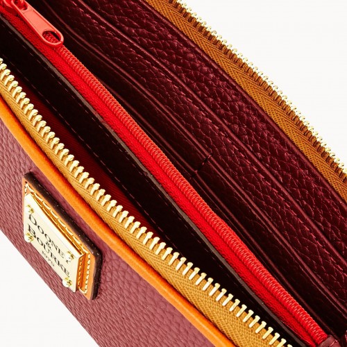One inside zip compartment. Two inside compartments. Eight credit card slots. Lined. Zipper closure.