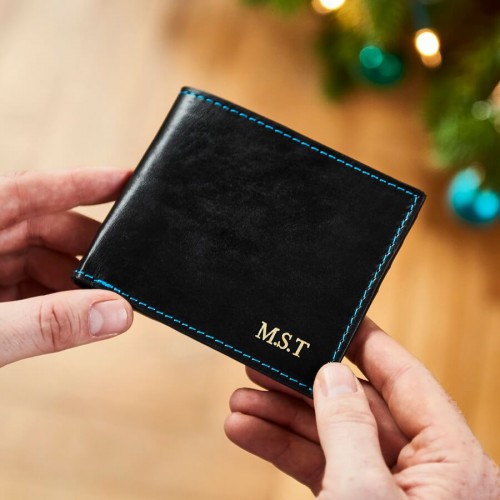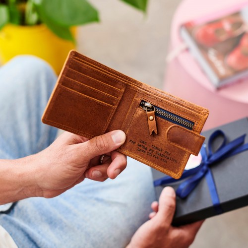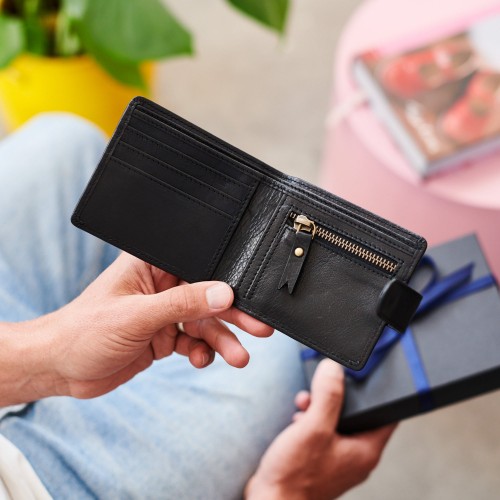 The wallet features ample card slots and a secure zip-up compartment for coins and notes, keeping all essentials organised and safe. Personalisation options add a thoughtful touch: choose hot-stamped initials in gold, black, or blind (heat-only) on the outside, or engrave a secret message inside for a truly memorable gift.